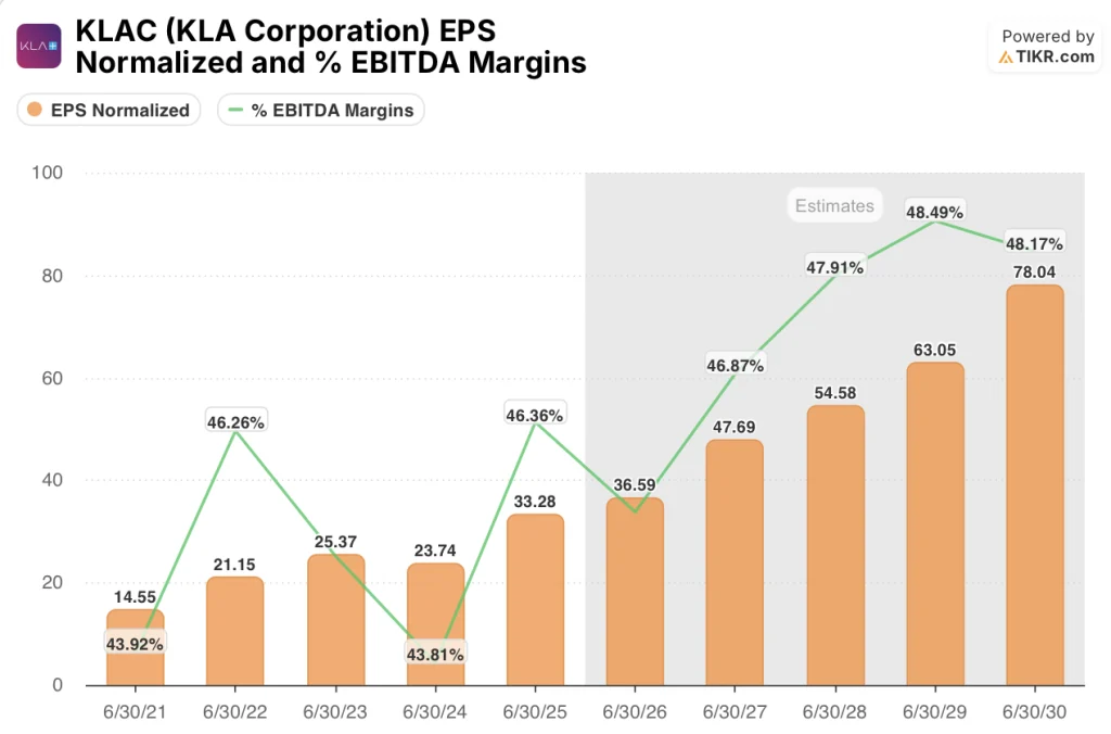 TIKR estimates place KLA’s normalized EPS at $33.28 in FY2025, rising to $36.59 in FY2026E and $78.04 by FY2030E, a 17.3% CAGR, as greenfield fab construction, accelerating high-bandwidth memory adoption, and advanced packaging share gains drive EBITDA margins from 46.4% to 48.2% while the service business, which tripled from $1 billion to $3 billion in six years, compounds at its raised 13% to 15% annual target.