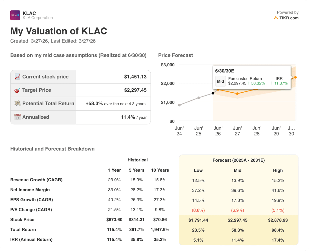 The TIKR mid-case target of $2,297.45, implying 58.3% total return at an 11.4% IRR by June 30, 2030, is built on 13.9% revenue CAGR and net income margin expansion to 39.6%, justified by KLA’s process control intensity rising from 7.4% to a targeted 9% of a $215 billion wafer equipment market that management sees as structurally underpinned by AI-driven chip complexity.