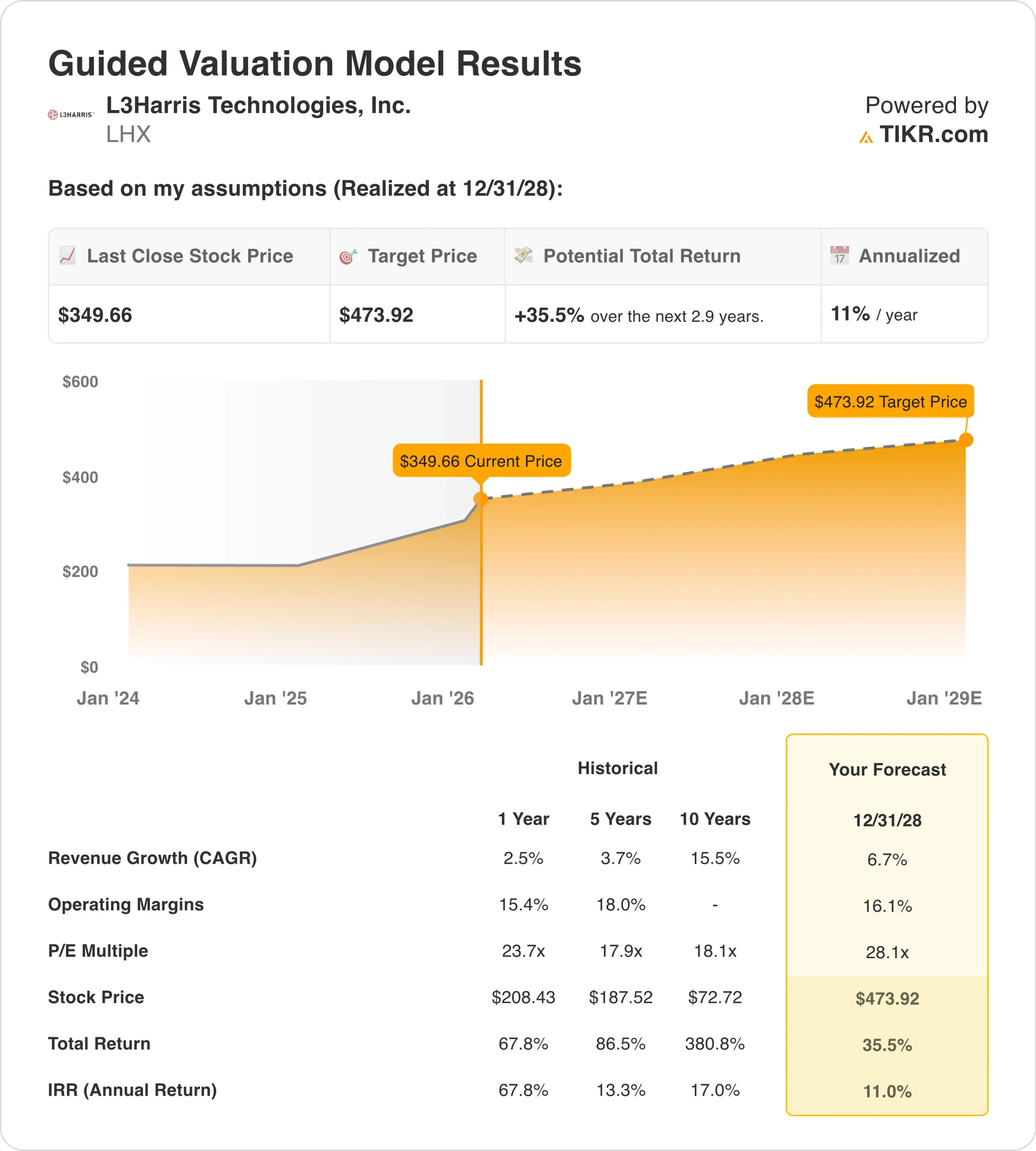 Based on these inputs, the model estimates a target price of $473.92, implying a 35.5% total return from the current share price of $349.66 and an annualized return of 11.0% over the next 2.9 years.