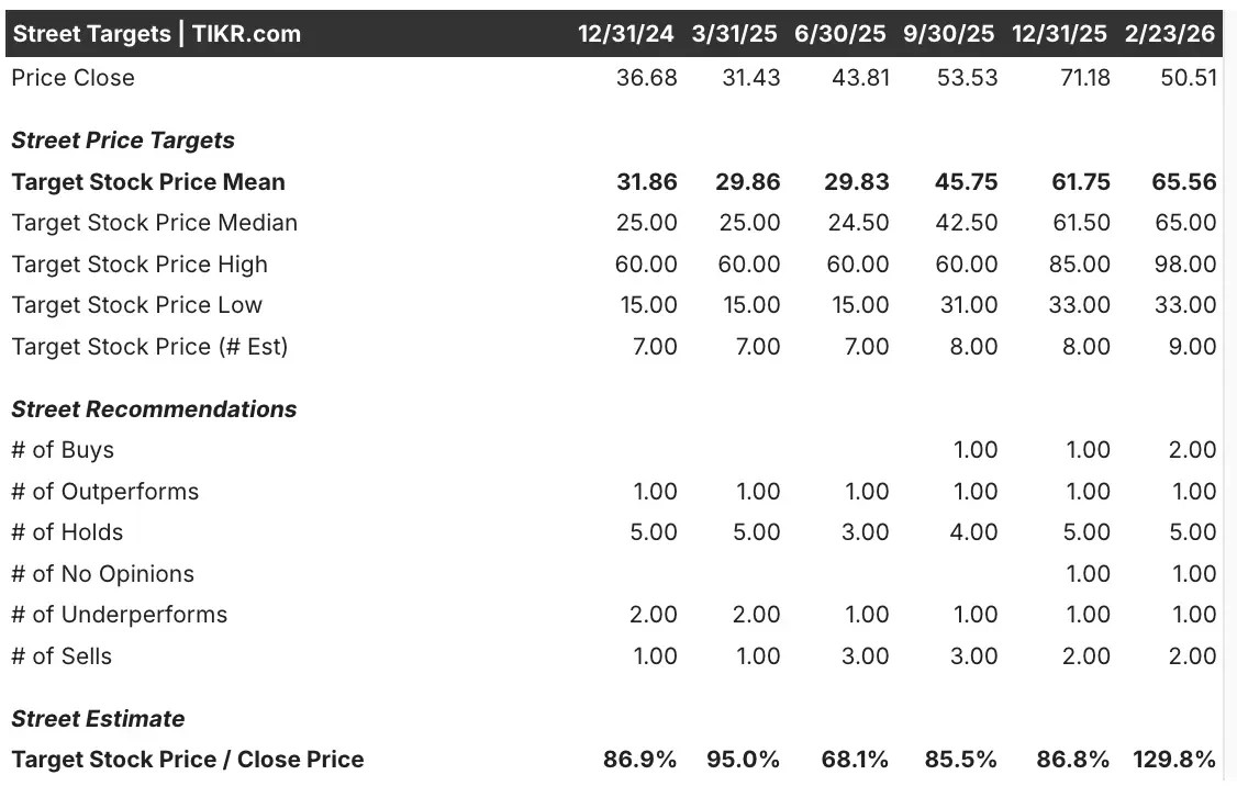 The target-to-price gap widened because the stock pulled back. It also widened because targets moved up into early 2026. The mean target rose from $31.86 at 12/31/24 to $65.56 by 2/23/26.