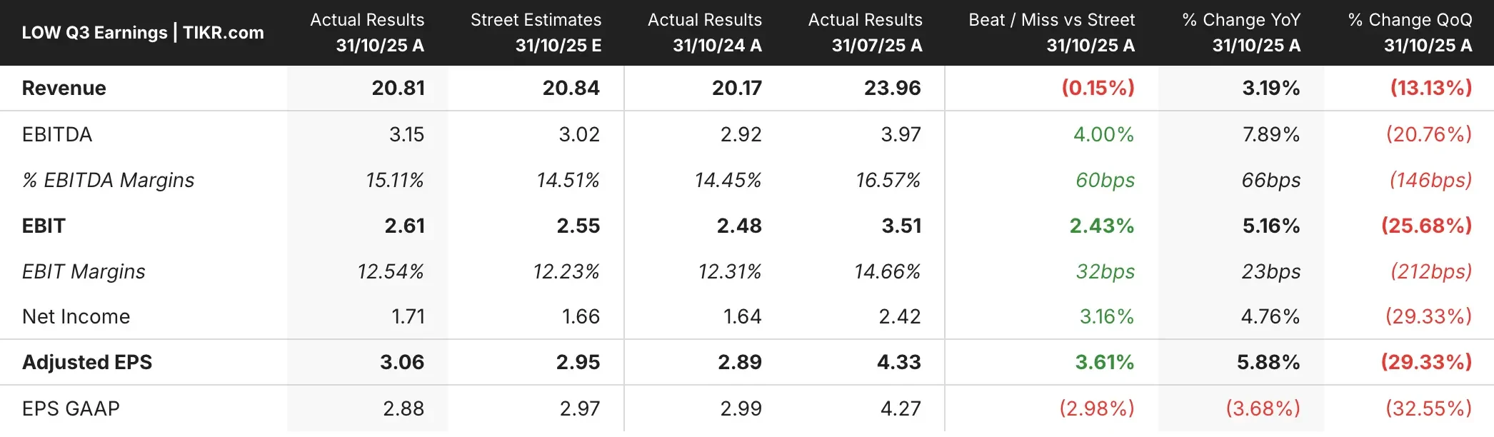 Comparable sales rose 0.4% despite a 100-basis-point headwind from lapping hurricane activity last year. More importantly, CEO Marvin Ellison said the company is seeing positive comps at the start of the fourth quarter, suggesting momentum is building heading into the holidays.