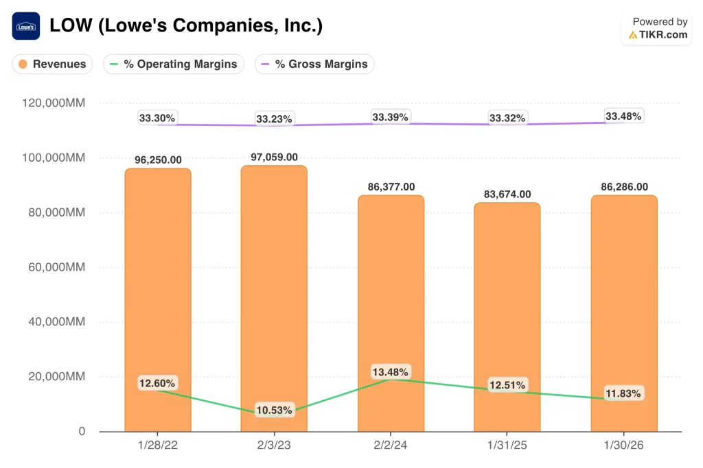 Those assumptions are fairly measured for a mature retailer. Lowe’s generated $86.3 billion of revenue in fiscal 2025, and gross margin held at 33.5%. Operating margin was 11.8%, so the model is not asking for a dramatic turnaround.