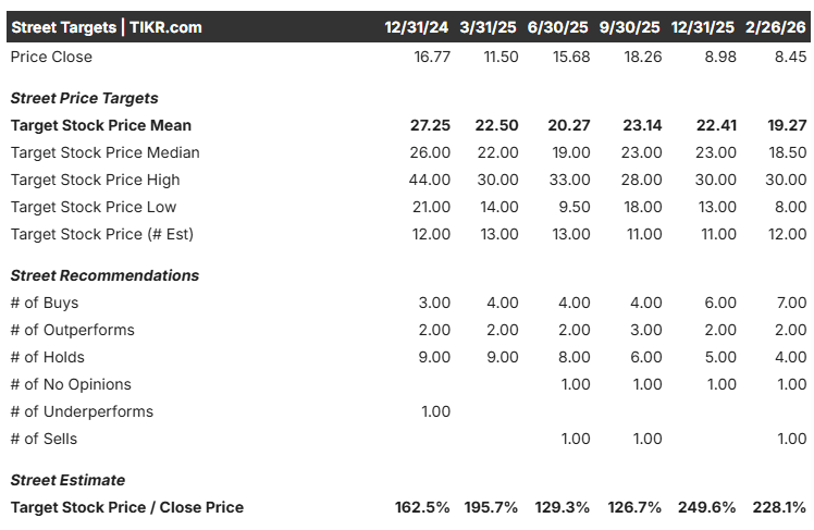 The consensus Street target price of $19.27 represents a massive 114.3% potential total return from the $8.99 baseline.