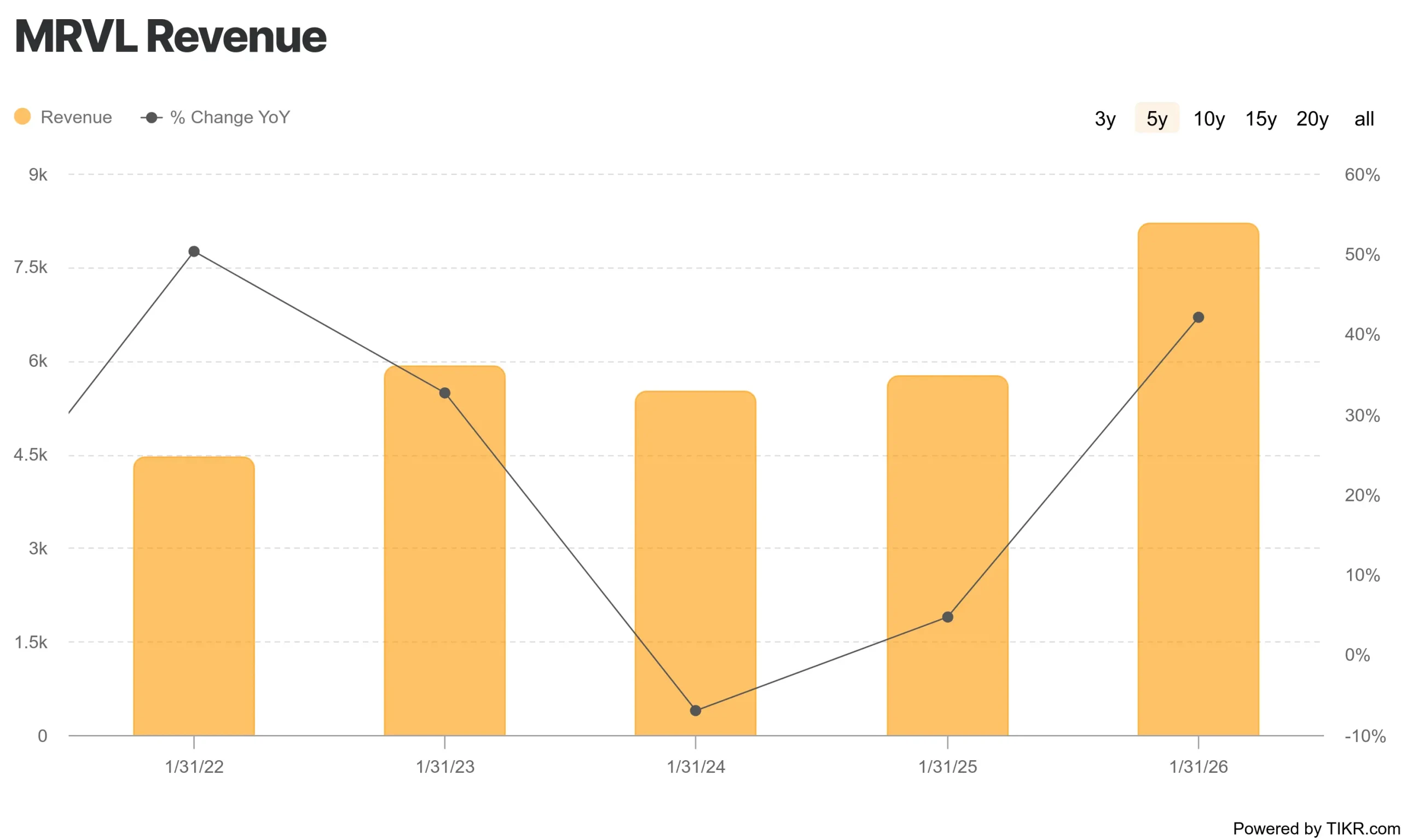 Value your favorite stocks like MRVL with 5 years of analysts’ forecasts using TIKR’s new Valuation Model (It’s free) >>>