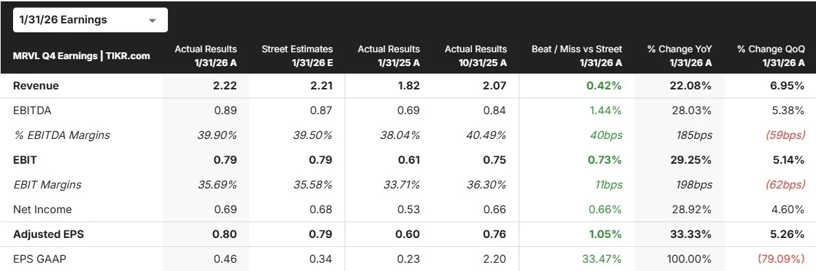 Marvell Technology (MRVL) stock jumped after the company reported record results for its Q4 and full fiscal year 2026.