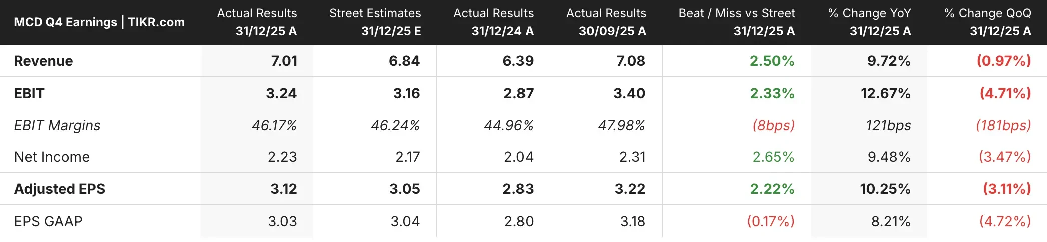 McDonald’s posted adjusted earnings of $3.12 per share on revenue of $7 billion, topping analyst estimates of $3.05 per share and $6.84 billion in revenue. Net income climbed to $2.16 billion from $2.02 billion a year earlier, while revenue surged 10% year-over-year.