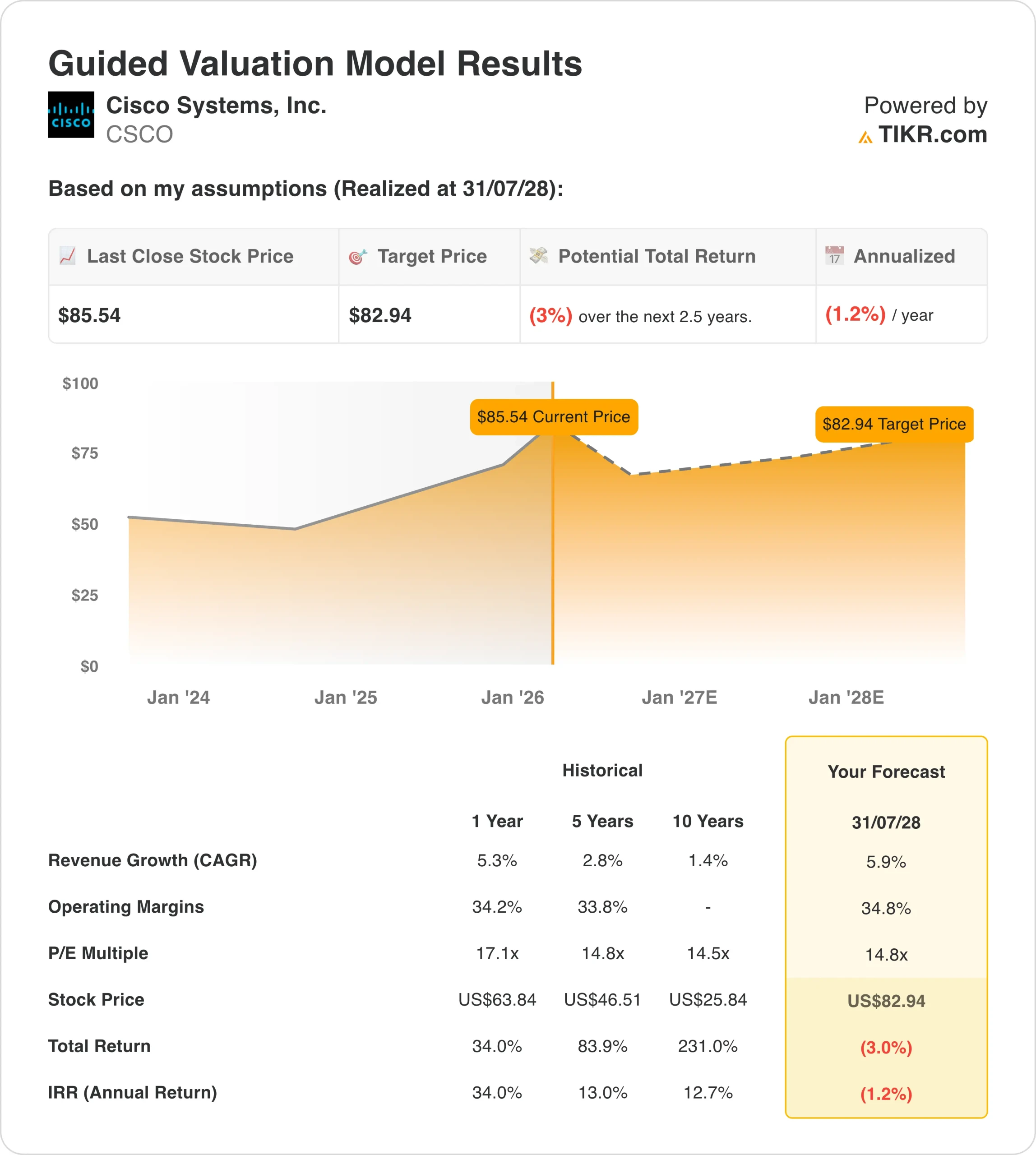 From there, TIKR calculates the potential share price and total returns under Bull, Base, and Bear scenarios so you can quickly see whether a stock looks undervalued or overvalued.