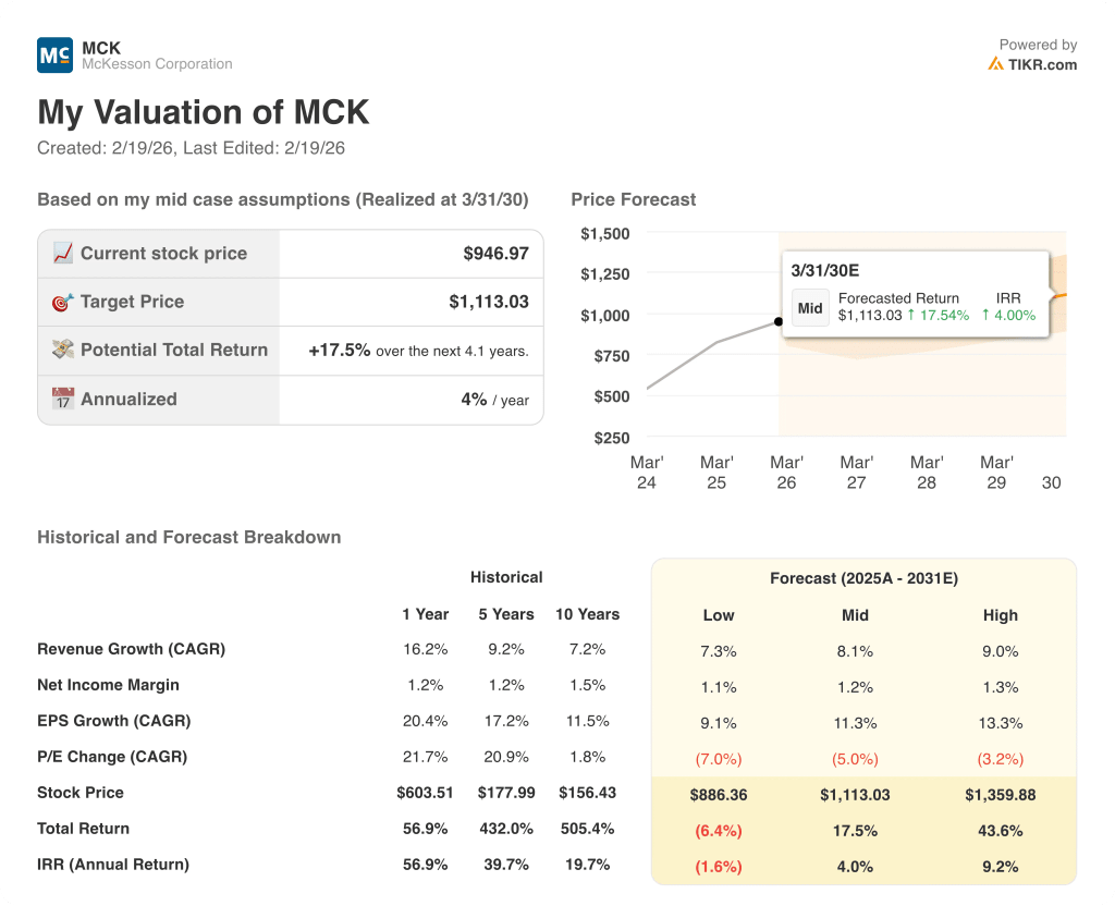 - Price Target: Based on 12% revenue growth, 1.6% operating margins, and a 17.4x exit multiple, McKesson stock could reach $1,066 by March 2028 from $947 today.