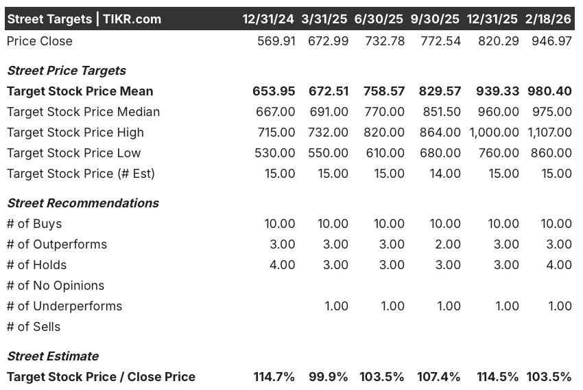 The street mean target of $980 against a $947 close produces a target-to-price ratio of 103.5%, compressing from 114.7% at December 2024 as the stock ran faster than analyst targets, while the current recommendation breakdown of 10 Buys, 3 Outperforms, 4 Holds, and 1 Underperform reflects stable conviction that has not materially strengthened despite the 43% gain in 2025.