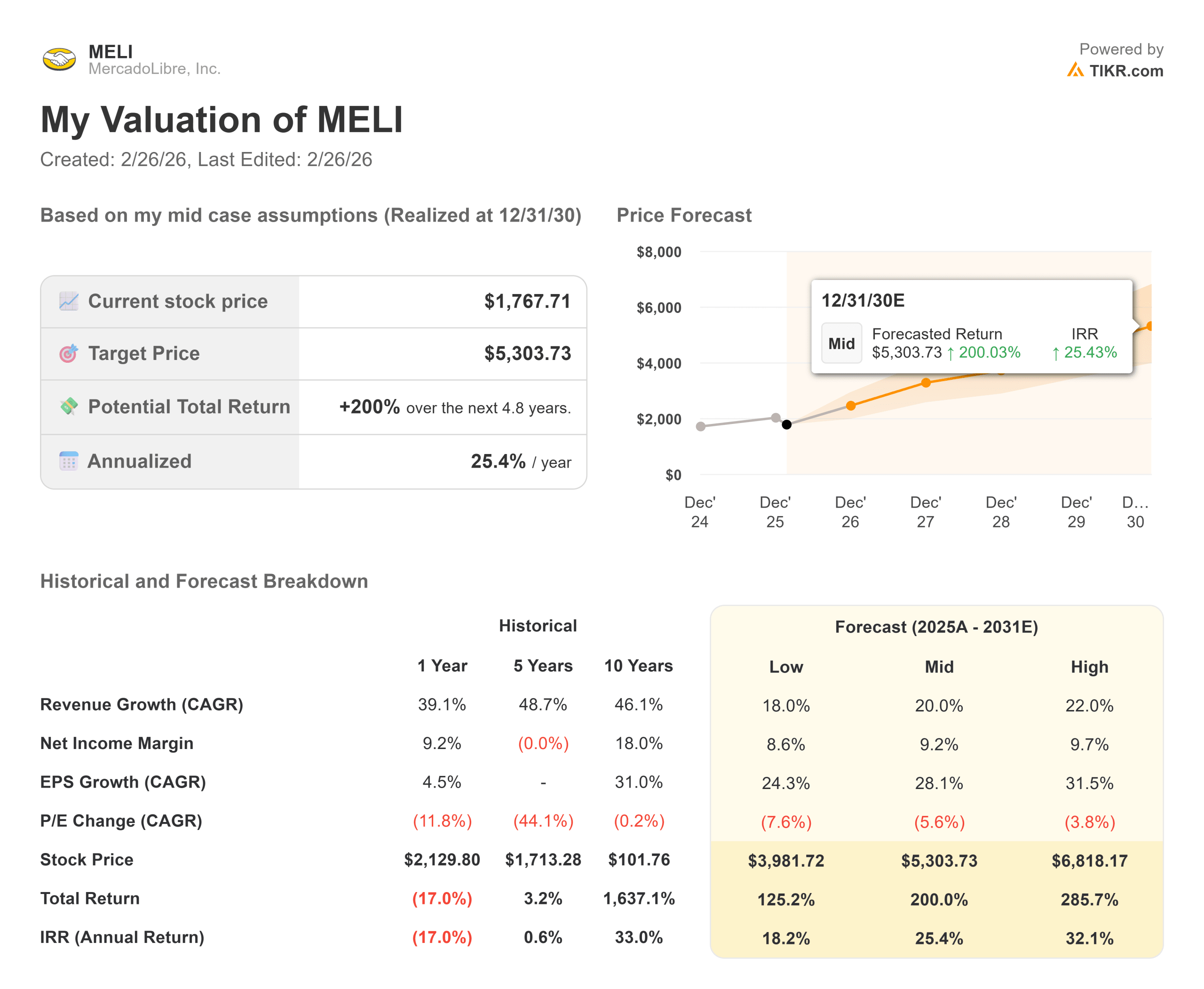 Hyper-Growth and Long-Term Leverage: MercadoLibre operates in a geography where the structural shift from offline to online retail is still highly underpenetrated compared to the United States. According to the TIKR Historical Breakdown, the company has delivered an astonishing 48.7% Revenue CAGR over the last 5 years. As the massive investments in cross-border trade and first-party logistics achieve terminal scale, the operating leverage will trigger a massive structural expansion in profitability. The TIKR Model projects the Net Income Margin to more than double to 18.0% over the next decade.
