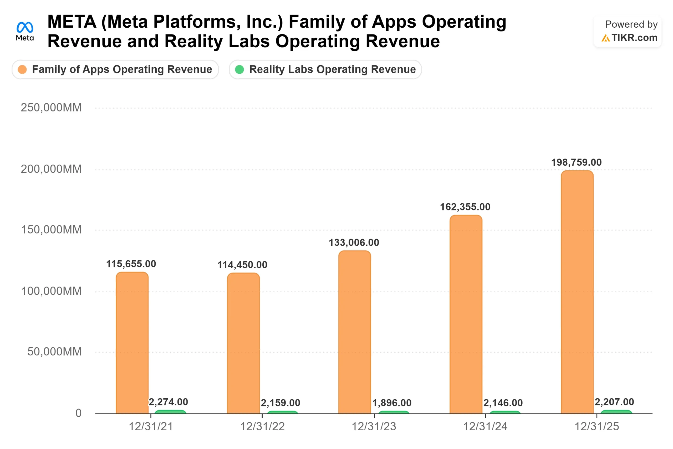 Meta’s Family of Apps segment generated $198,759 million in revenue and $102,469 million in operating income in FY2025.