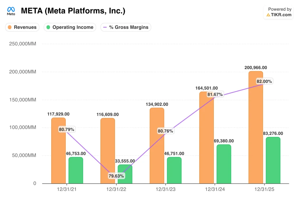 The business fundamentals remain strong. Revenue rose 22.2% to $201.0 billion in 2025, operating income reached $83.3 billion, and gross margin expanded to 82.0%. Those numbers show that Meta’s Family of Apps business is still monetizing engagement efficiently, even as the company keeps investing in AI, infrastructure, and Reality Labs.