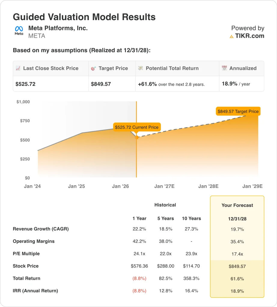 Value your favorite stocks like META with 5 years of analysts’ forecasts using TIKR’s new Valuation Model (It’s free) >>>
