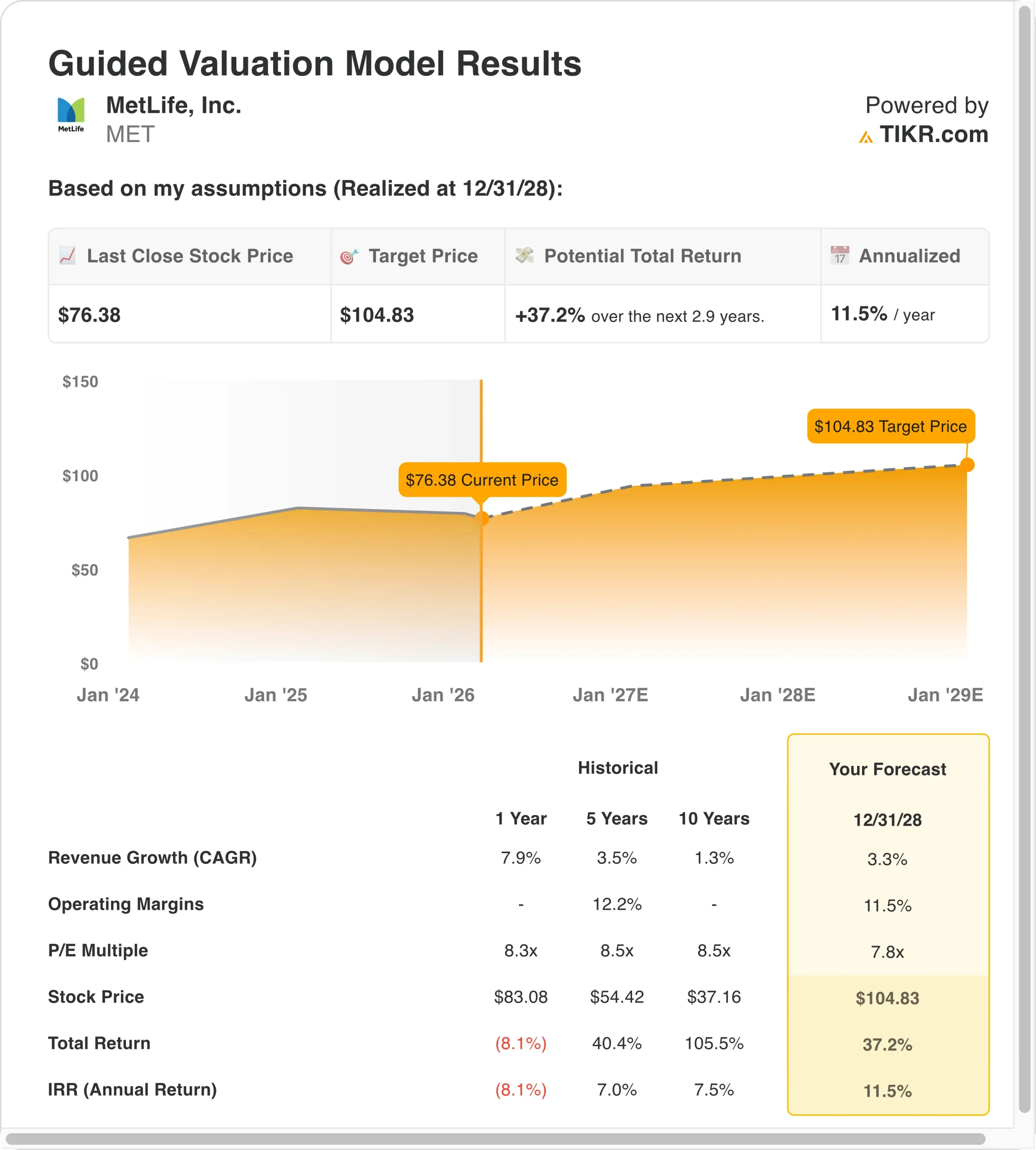 Value your favorite stocks like MetLife with 5 years of analysts’ forecasts using TIKR’s new Valuation Model (It’s free) >>>