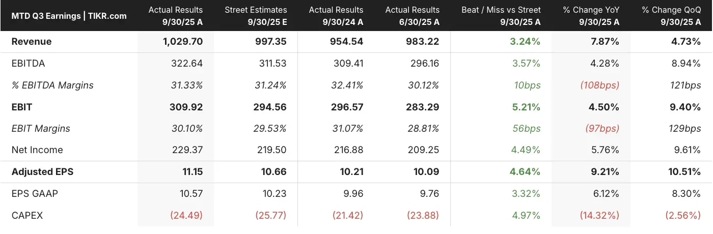 Margin expansion mattered, and it reinforced confidence in MTD’s operating model.