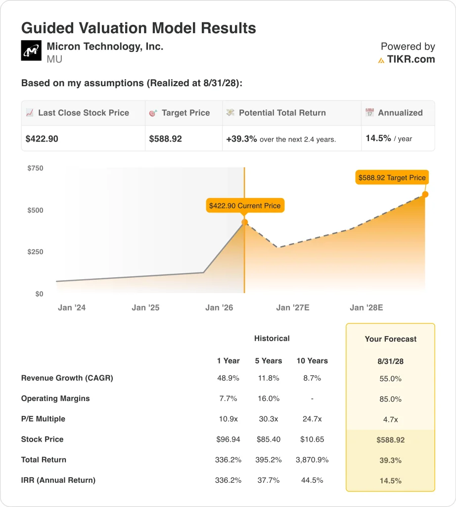 Value your favorite stocks like Micron with 5 years of analysts’ forecasts using TIKR’s new Valuation Model (It’s free) >>>