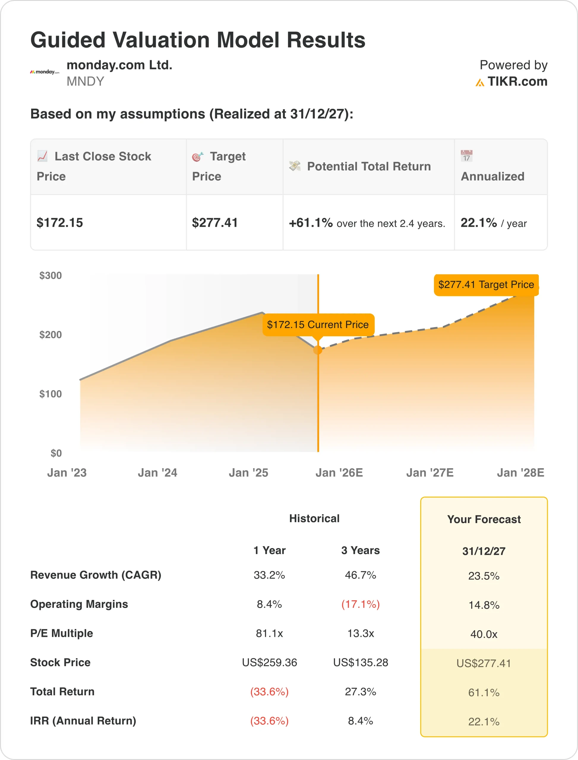 Based on estimates of 23.5% annual revenue growth, 15% operating margins, and a normalized P/E valuation multiple of 40.0x, the model projects MNDY stock could rise from $172/share to $277/share.