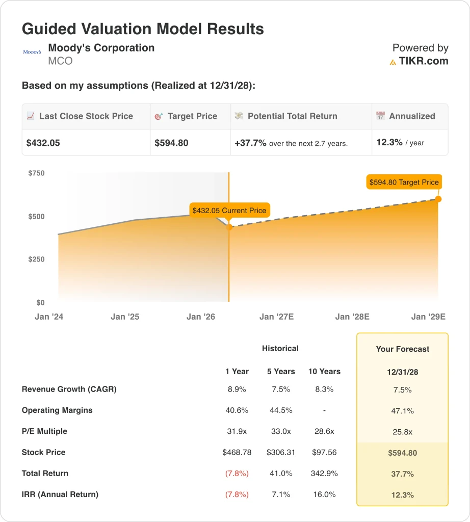 Value your favorite stocks like MCO with 5 years of analysts’ forecasts using TIKR’s new Valuation Model (It’s free) >>>