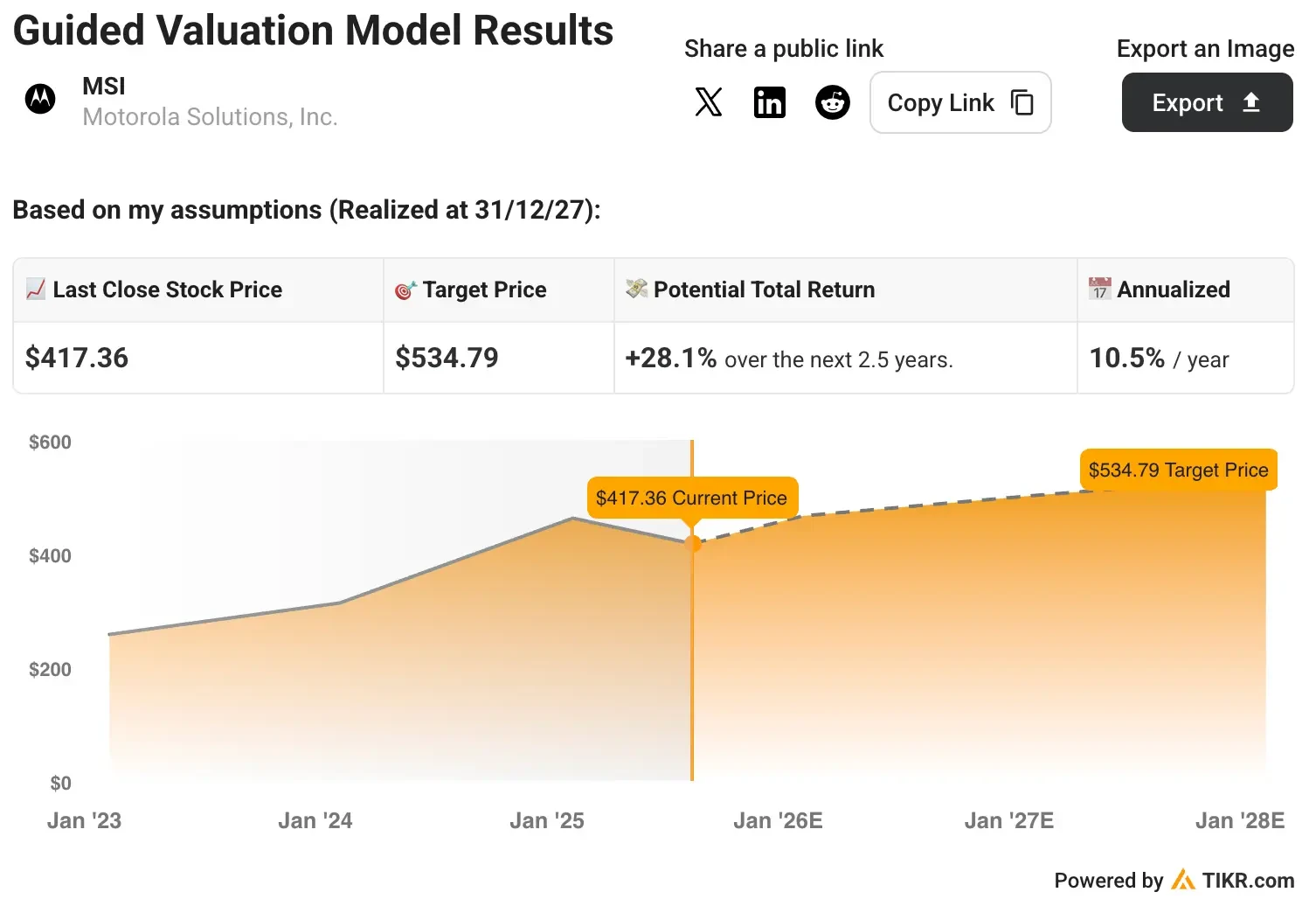 With these inputs, our valuation model estimates MSI stock could reach approximately $535 per share by the end of 2027, representing a potential 28% gain from current levels around $417.