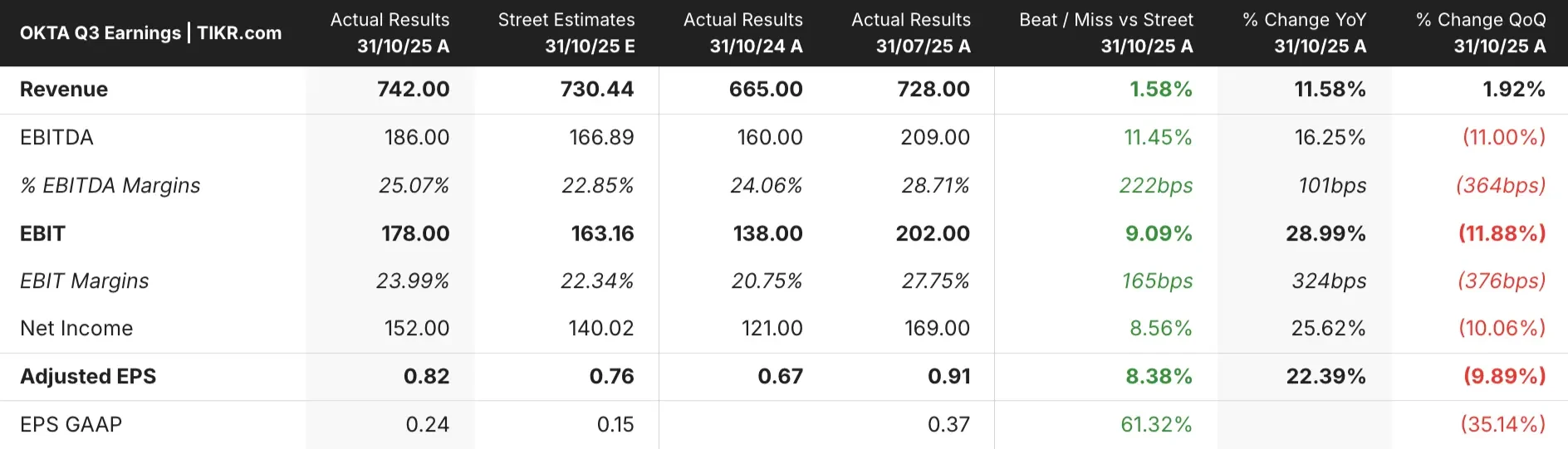 Okta (OKTA) stock dropped over 3% in pre-market despite beating Wall Street expectations for the third quarter. The identity management company reported adjusted earnings of $0.82 per share on revenue of $742 million, both ahead of analyst estimates.