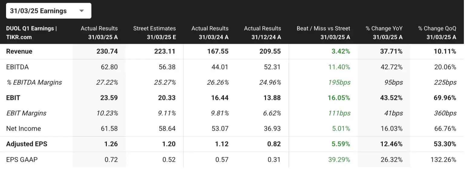 DUOL stock jumped over 20% in a single trading session on Friday, after the company reported first-quarter results that significantly surpassed Wall Street’s expectations.