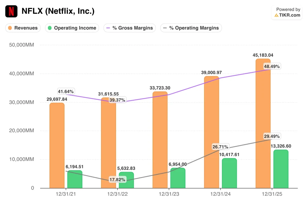 Those assumptions start from a business that is already operating at a very large scale. Revenue rose 15.9% to $45.2 billion in 2025, while operating income increased 27.9% to $13.3 billion. Gross margin also expanded to 48.5%, and operating margin reached 29.5%. That means Netflix is growing revenue and profit at the same time, which supports a premium multiple.