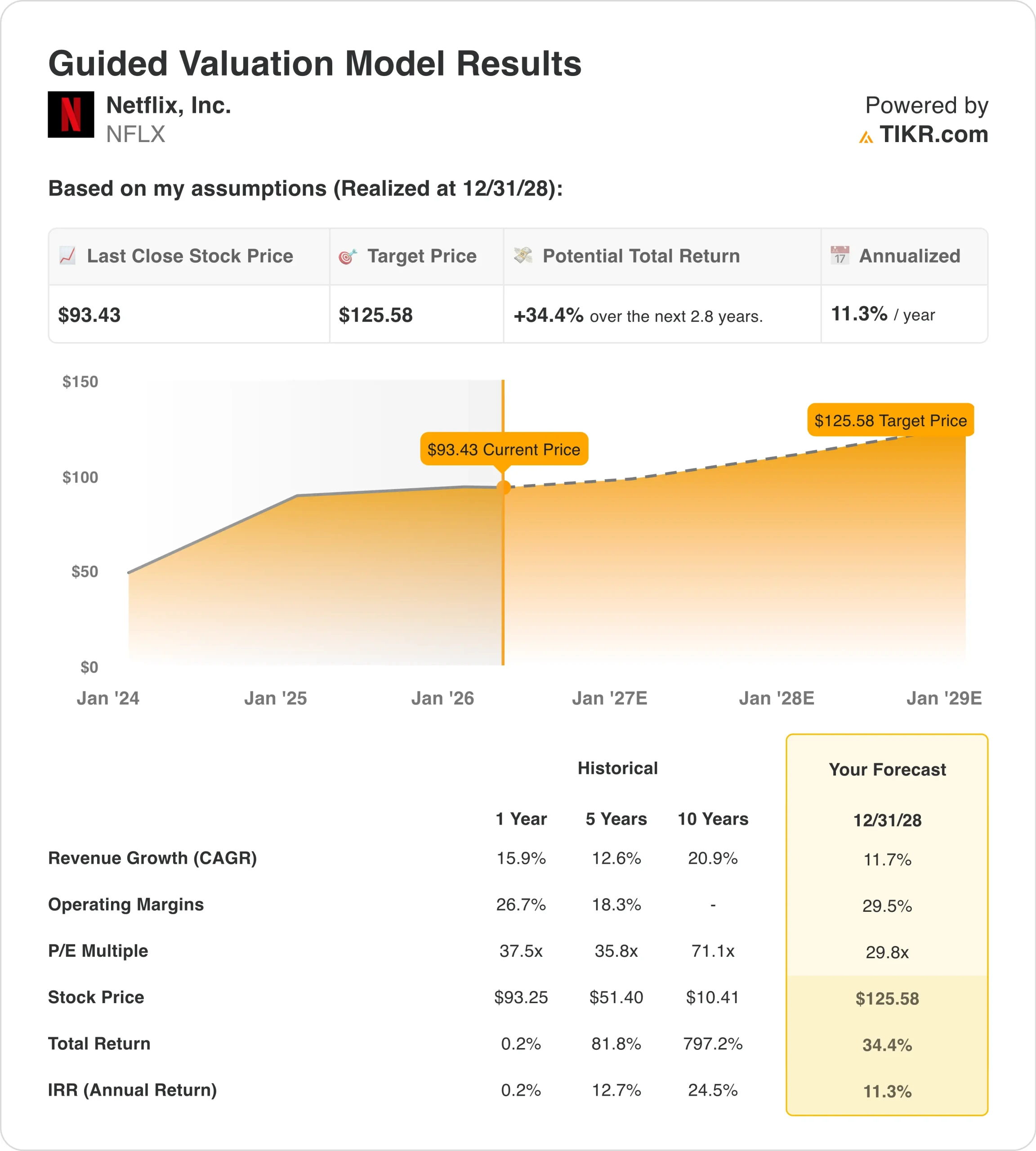 Based on these inputs, the model estimates a target price of $126, implying 34.4% total upside from the current share price and a 11.3% annualized return over the next 2.8 years.