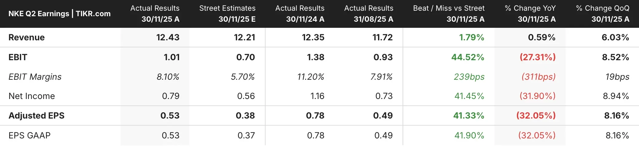 Nike (NKE) stock is down over 10% in pre-market despite beating Wall Street estimates for earnings and revenue in its second fiscal quarter.