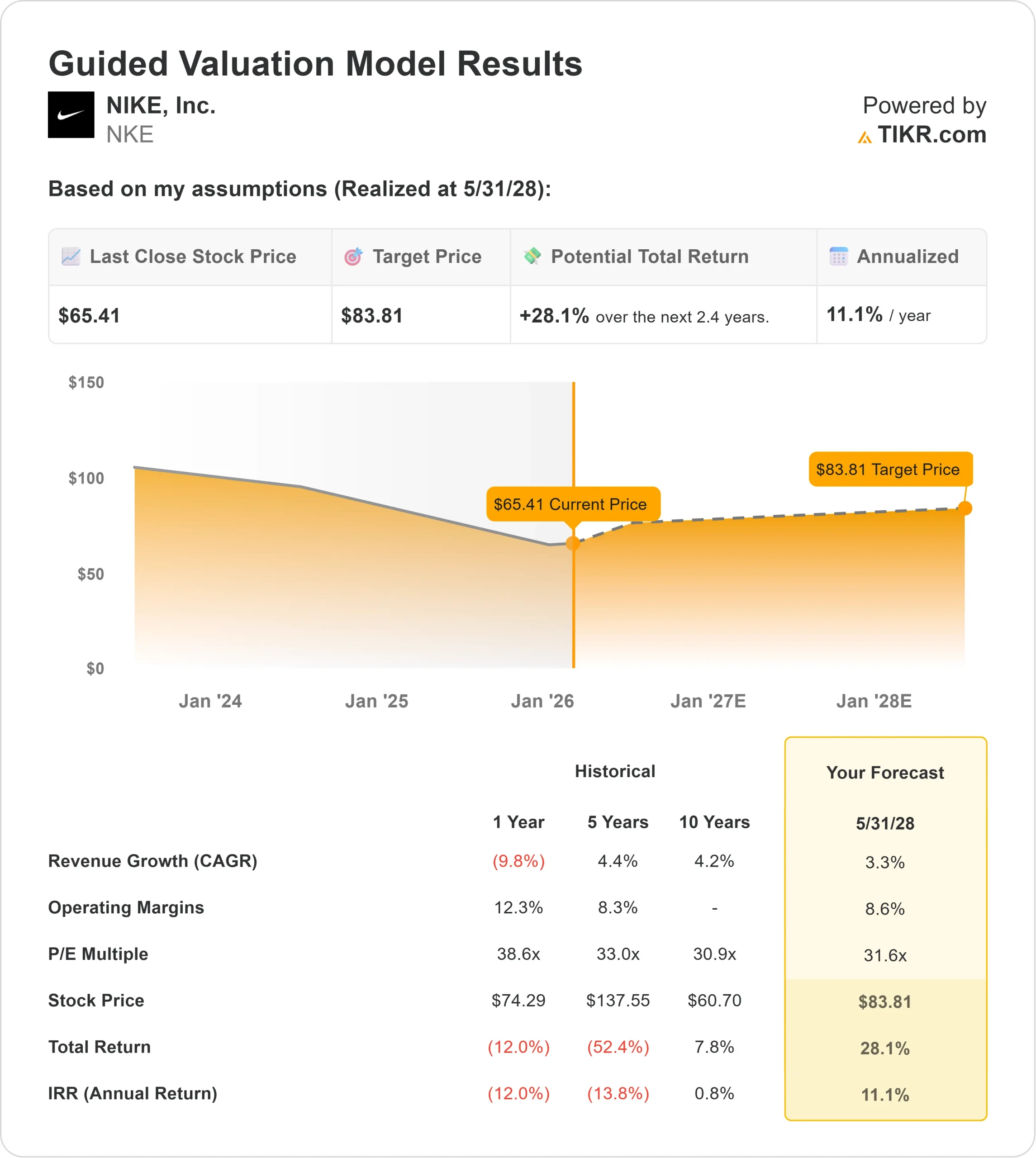 - High Case: If Nike re-ignites double-digit growth, the stock could run to $136, delivering a strong 18.3% annual return.