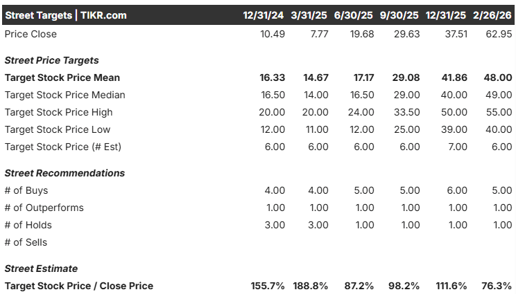 Current data suggests the stock is trading at a premium following a parabolic 540% 1-year return, with shares now trading above the consensus analyst price target.