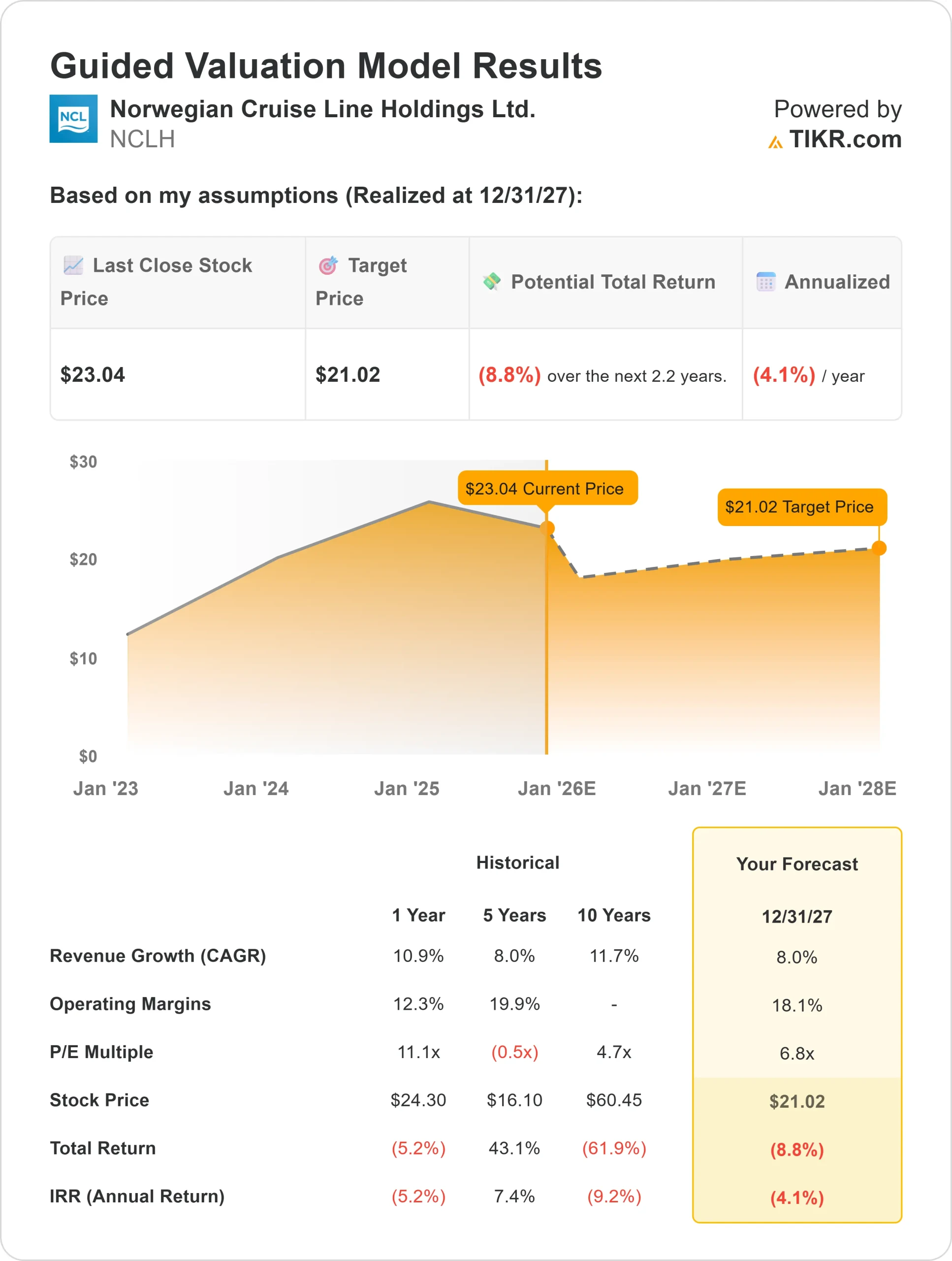 Based on analysts’ average estimates, TIKR’s Guided Valuation Model suggests Norwegian could trade near $21/share by 2027, which implies roughly 9% downside from current levels. However, consensus analyst targets remain more optimistic, with an average price target of $31/share, or about 35% upside.