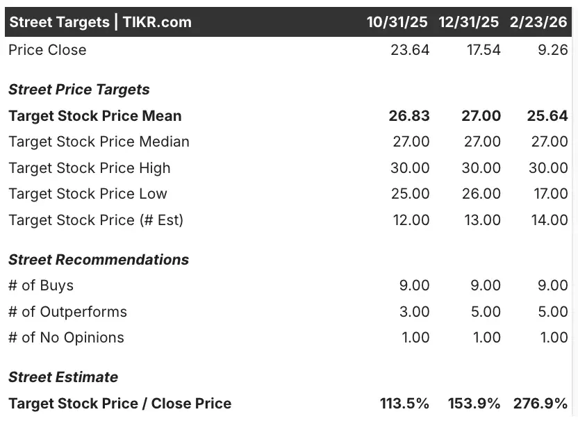 The implied gap reflects how sharply the stock has fallen rather than recent upward revisions. Analysts continue to model long-term revenue growth, even as near-term risks persist. High and low targets still range between $30 and $17.