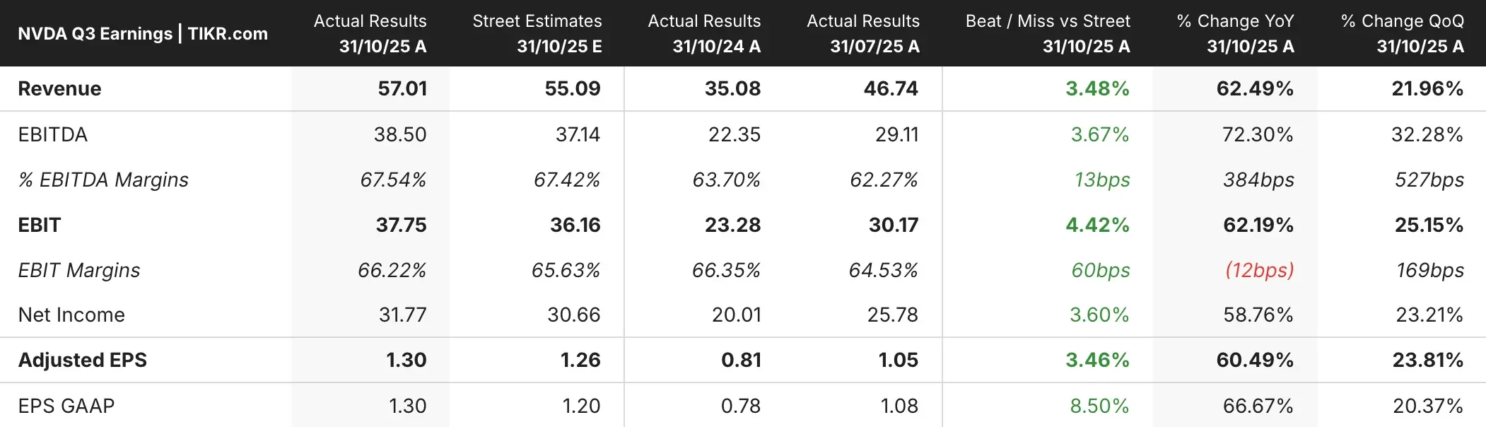 Data center revenue hit $51.2 billion, up 66% year-over-year and ahead of the $49.1 billion consensus. The company said its GB300 chips are ramping up production and that cloud GPUs are completely sold out.