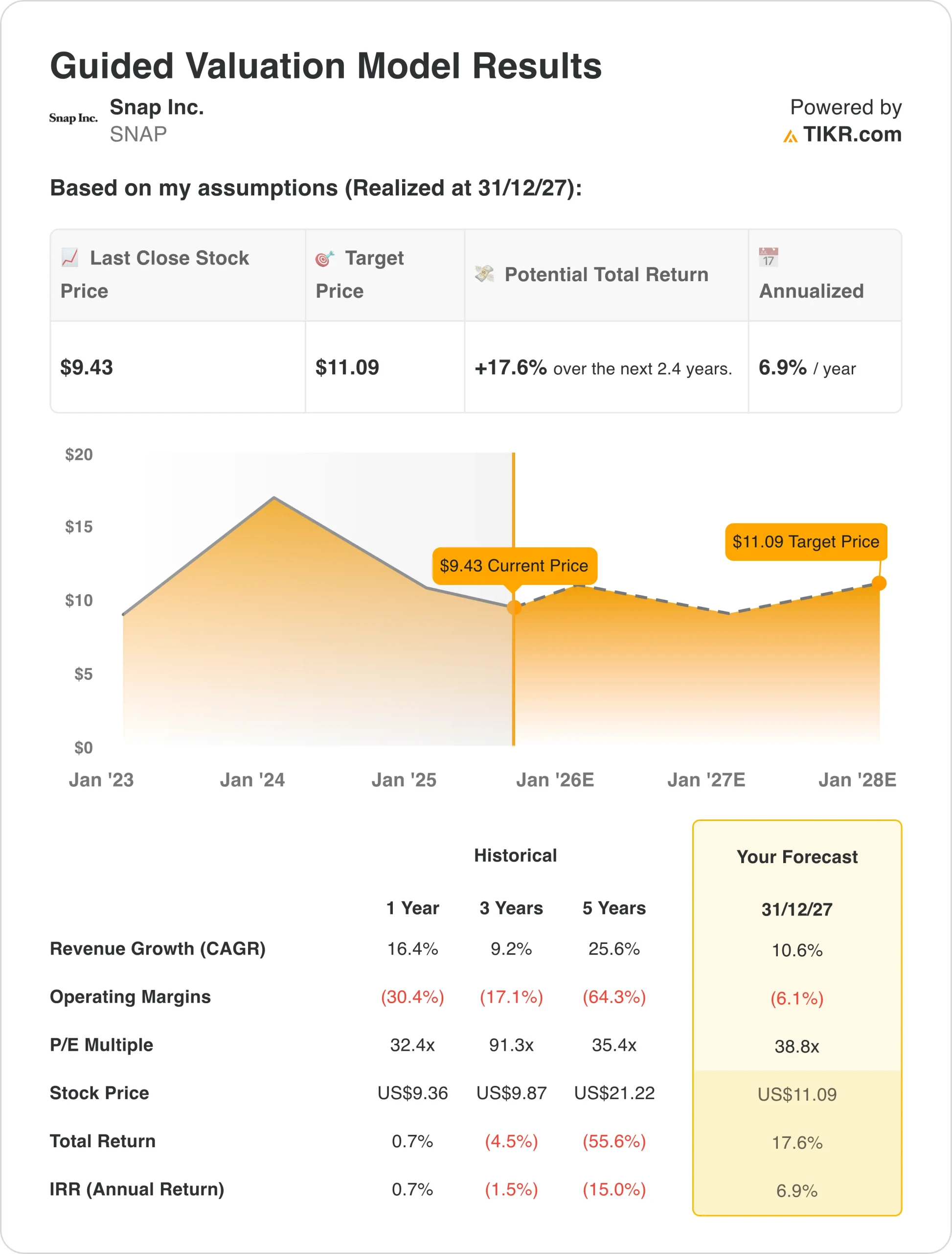 The model projects SNAP stock to appreciate from its current price of $9.43 to a target price of $11.09, representing a potential total return of 17.6% over the next 2.4 years.