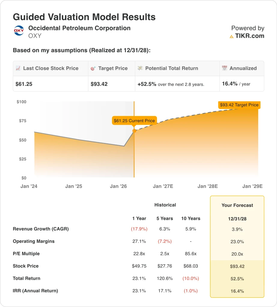 Based on estimates of 3.9% annual revenue growth, 23.0% operating margins, and a 20.0x P/E multiple, the model projects OXY stock could rise from $61 to $93 per share.