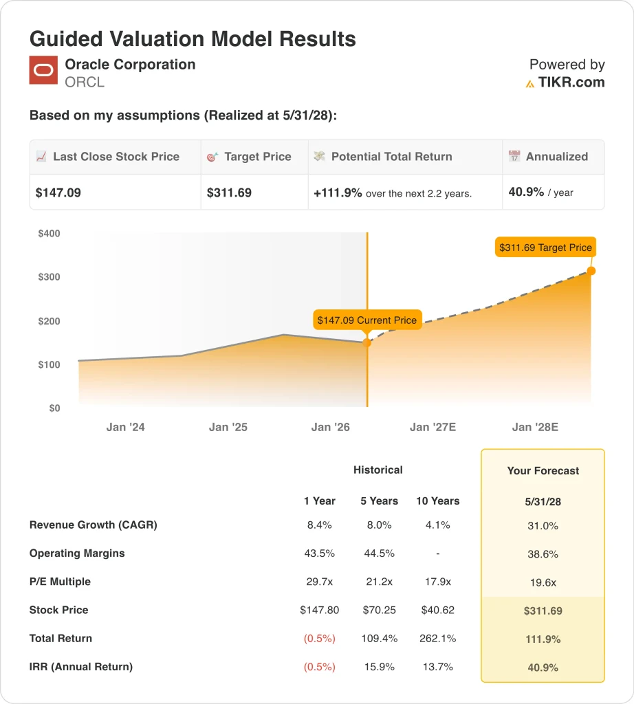 Based on estimates of 31.0% annual revenue growth, 38.6% operating margins, and a 19.6x P/E multiple, the model projects Oracle stock could rise from $147 to $312 per share.
