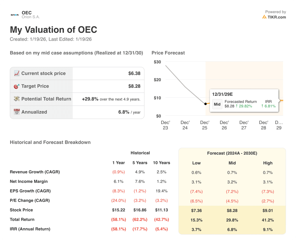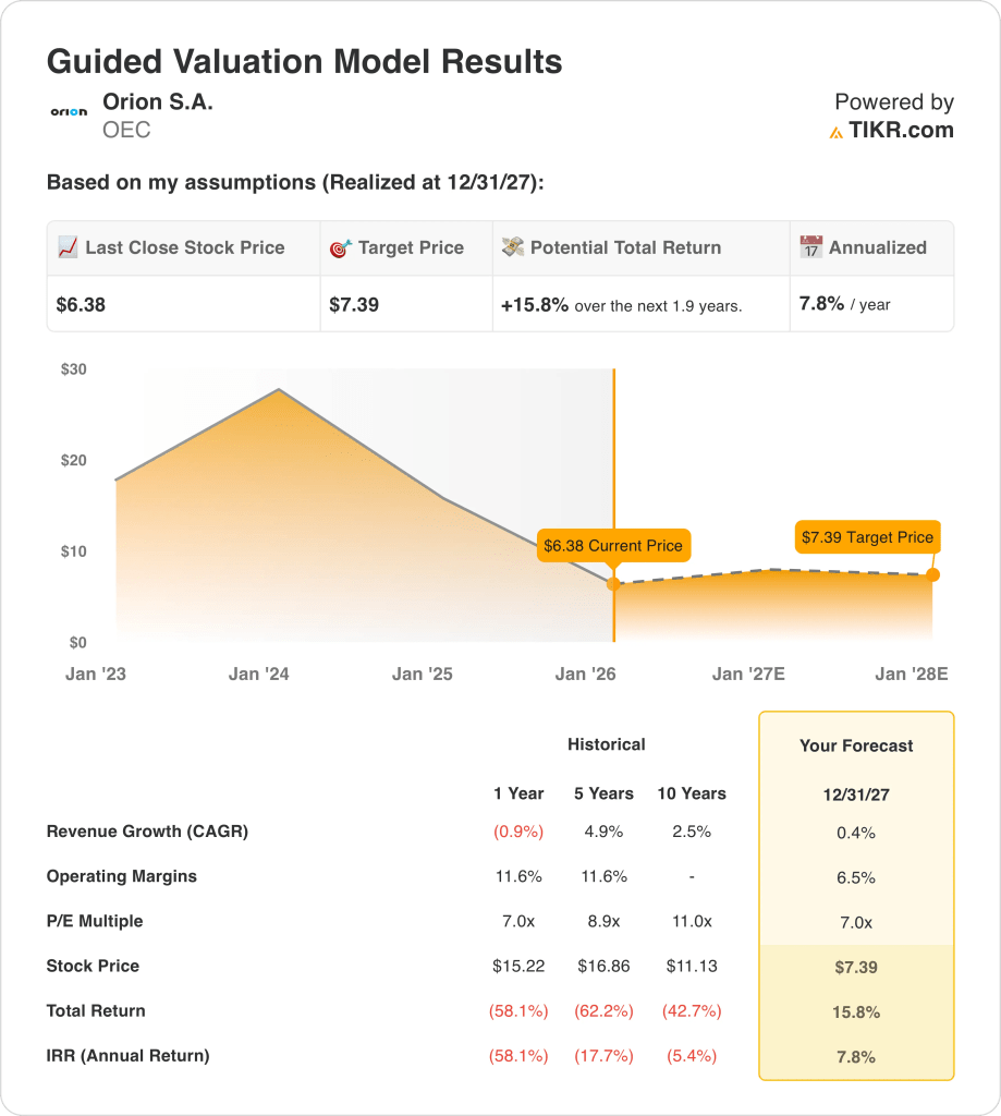 - Price Projection: Orion S.A. stock could reach $7 by 2027 based on modest recovery assumptions and a stable 7x exit multiple.