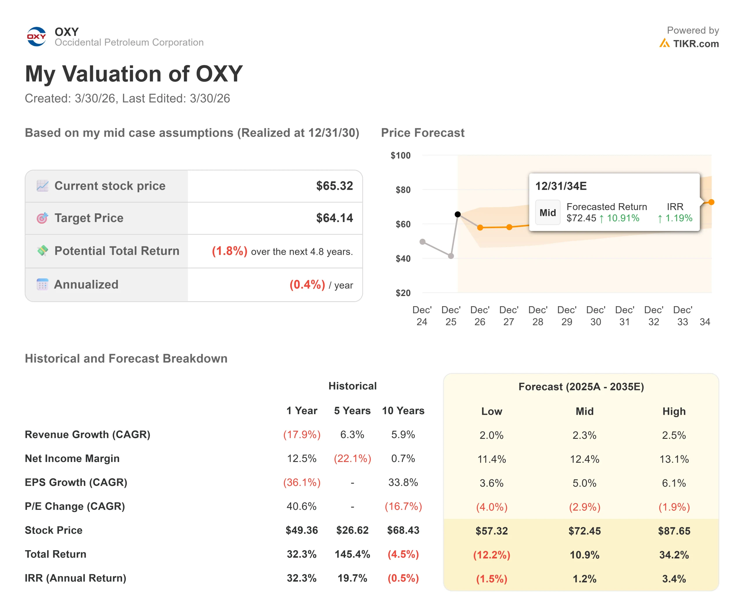 OXY has executed well: record production, a clean balance sheet, and four straight earnings beats. The challenge is that a stock that has gone up 58% in three months tends to be priced to perfection. At $65.32, the TIKR model says the market has largely caught up to the story.