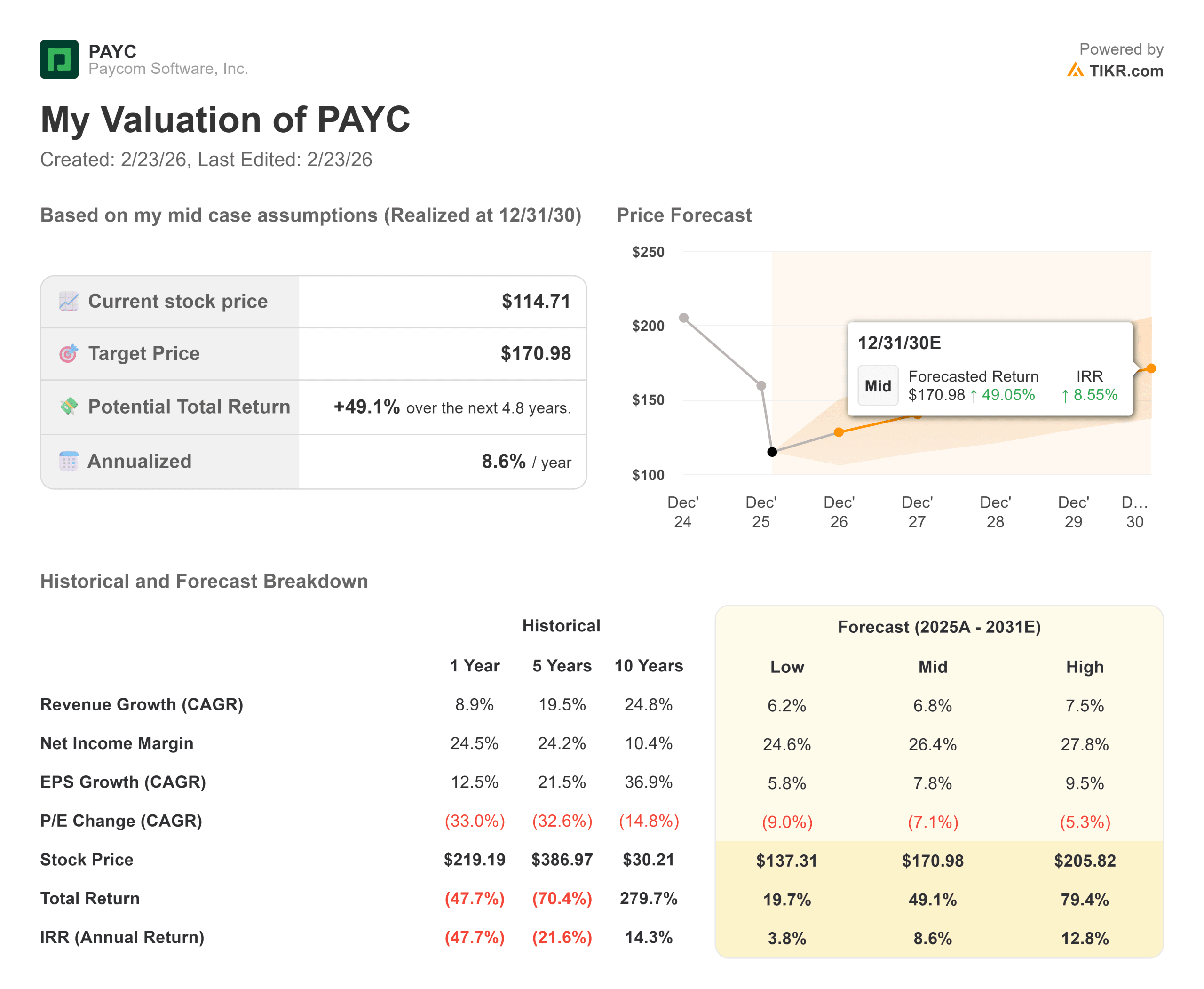 The TIKR Advanced Valuation Model identifies Paycom as a highly profitable software compounder trading at a steep discount to its historical valuation.