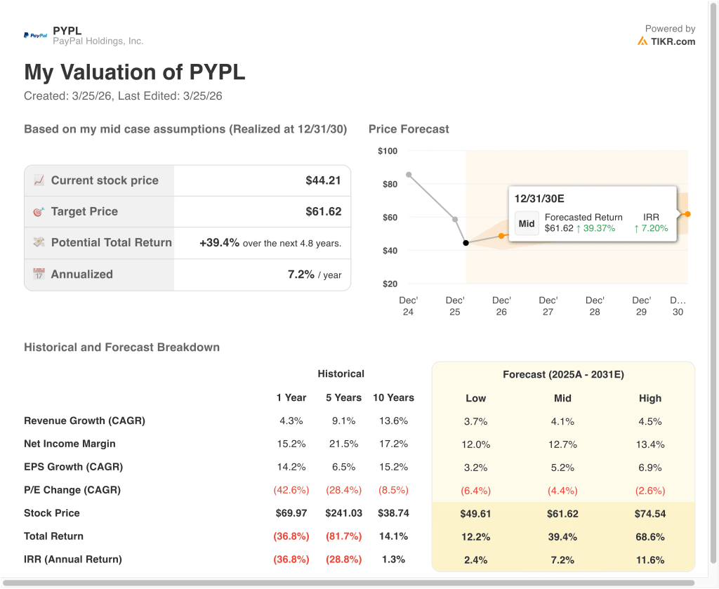 The model applies an 8.0x P/E multiple, which is below PayPal’s historical averages. This reflects a structural re-rating of the stock as growth slows. Investors are no longer willing to pay premium multiples for the business. The lower multiple is consistent with a more mature company profile.