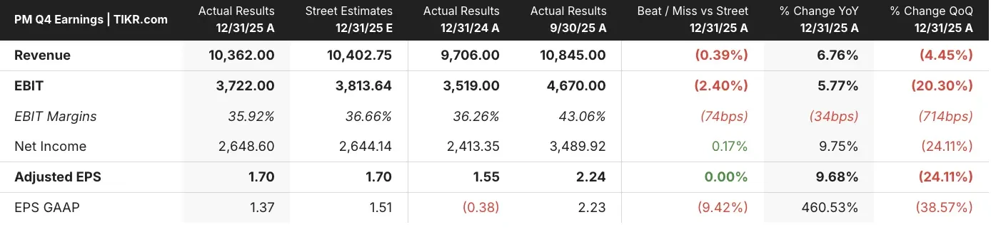 Philip Morris International (PM) shares were modestly higher after the company reported Q4 2025 earnings.
