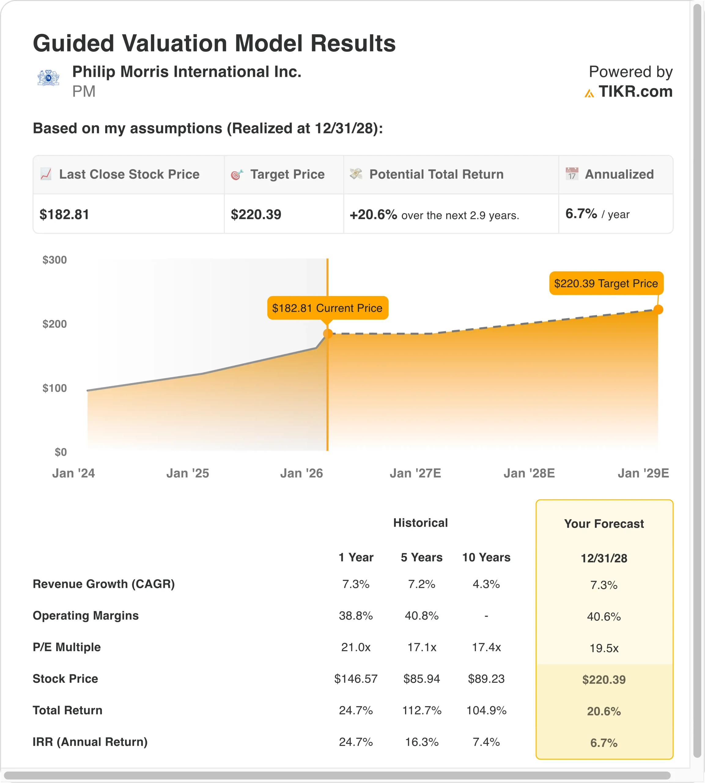 Based on the guided valuation model, PM’s fair value is estimated at $220.39 per share.