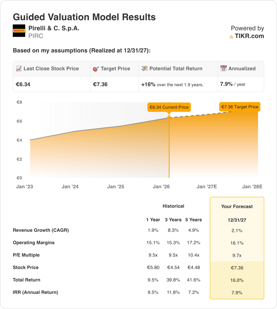 - Price Projection: Pirelli & C. S.p.A. stock could reach €7 by 2027 based on 2% revenue growth, 16% operating margins, and a 10x earnings multiple.
