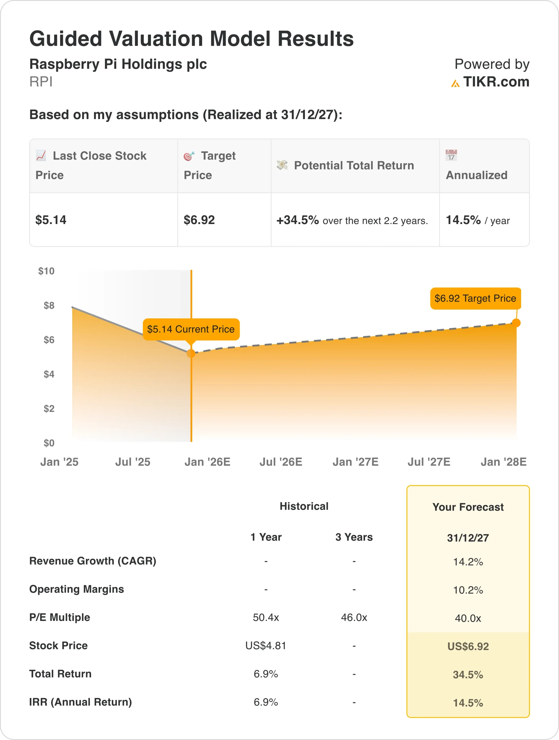 Based on estimates of 14% annual revenue growth, 10% operating margins, and a normalized P/E valuation multiple of 40x, the model projects Raspberry Pi stock could rise from $5.14/share to $6.92/share.