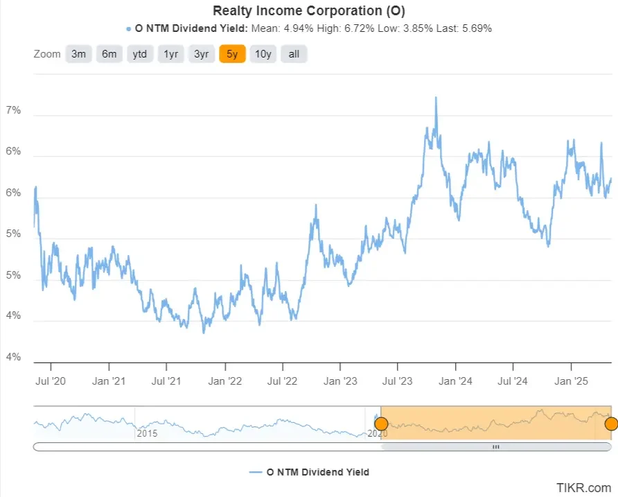 - Realty Income currently offers a 5.7% forward dividend yield, which is near the top of its historical range.