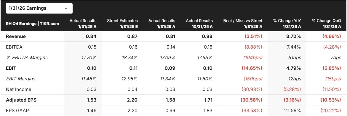 RH (RH) stock fell sharply after the luxury home furnishings retailer reported Q4 results that missed on both revenue and earnings — and offered cautious guidance for the year ahead.