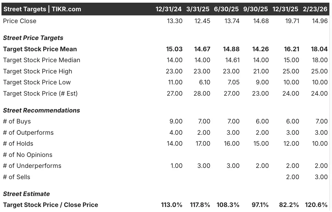 Rivian Automotive (RIVN) stock has fallen sharply since hitting its 52-week high in mid-December 2025. Shares peaked near $23 on December 19 but have since assumed a downward trend. The stock closed at $14.96 on February 23, marking a decline of more than 30%.