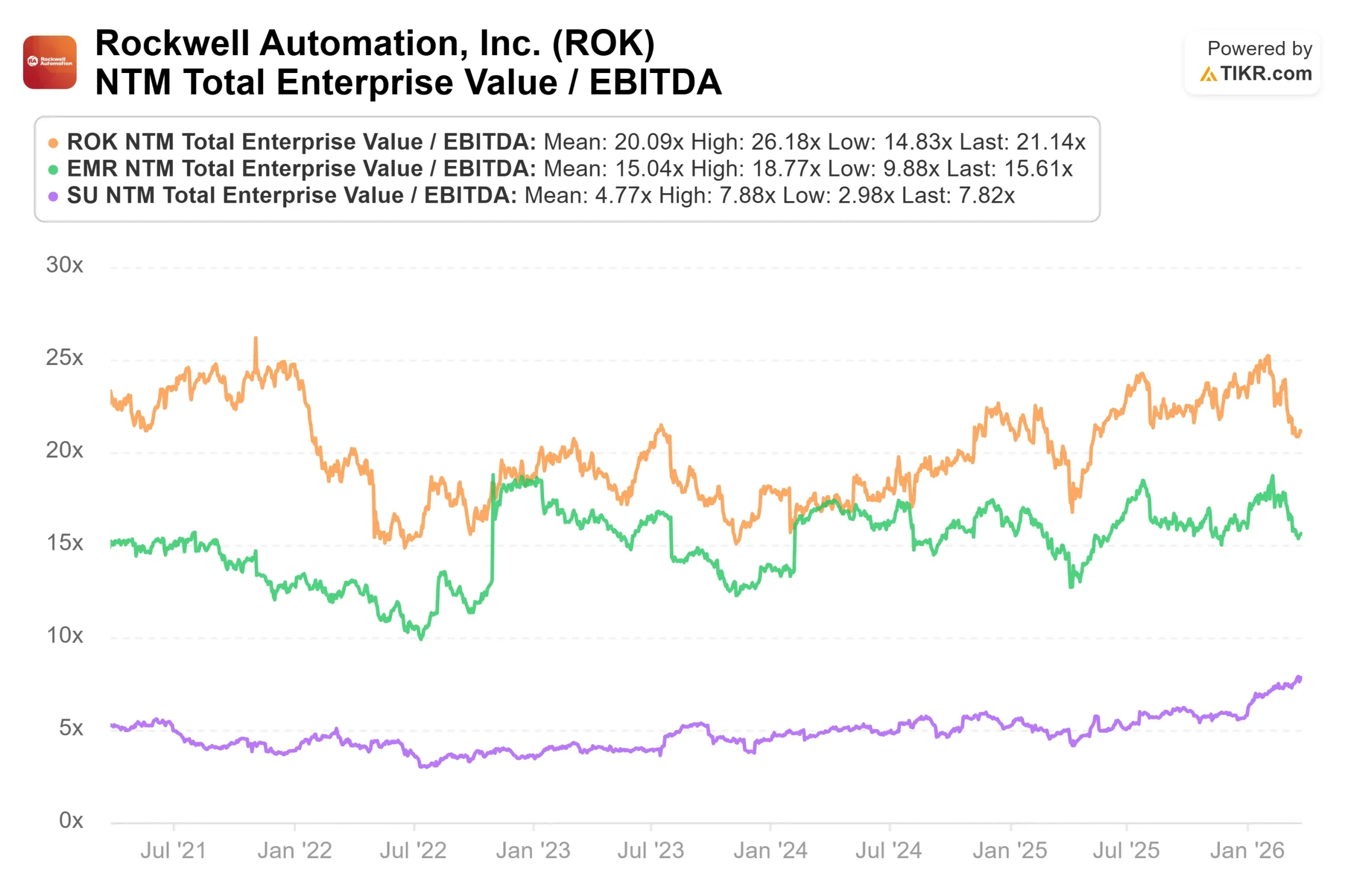 When evaluating standalone valuation data from TIKR, ROK currently trades at an NTM EV/EBITDA multiple of 21.17x and an NTM P/E of 29.12x.