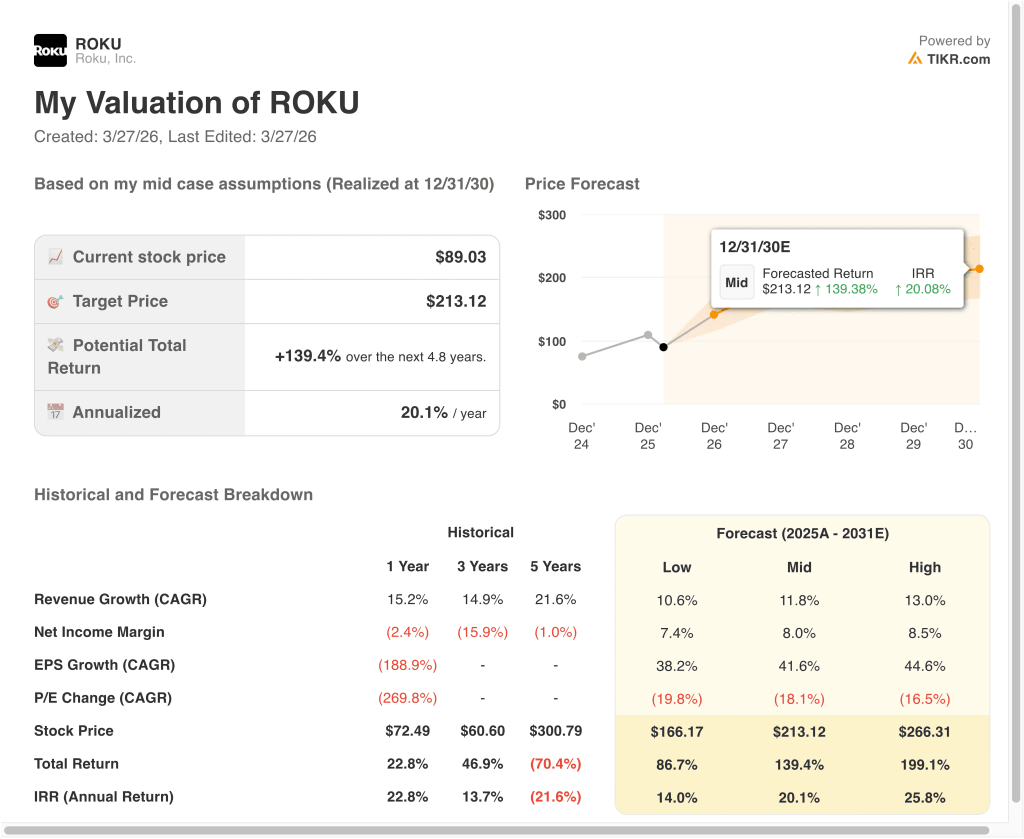 - Mid Case: Roku keeps scaling platform revenue, improves monetization, and converts more gross profit into earnings → 20.1% annual returns