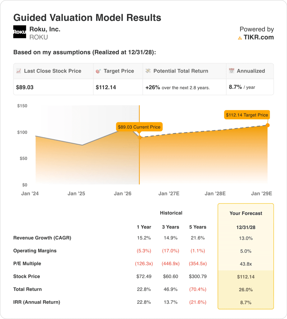 Based on estimates of 13.0% annual revenue growth, 5.0% operating margins, and a normalized P/E multiple of 43.8x, the model projects Roku stock could rise from $89.03 to $112.14 per share.